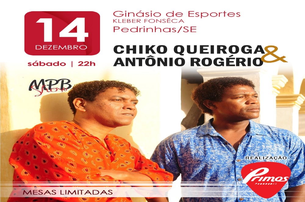Chiko Queiroga e Antônio Rogério levam seu show MPB à cidade Pedrinhas. O evento acontecerá no dia 14 de dezembro, a partir das 22h, no Ginásio de Esporte Kleber Fonsêca. Também haverá participação do Grupo Prime.