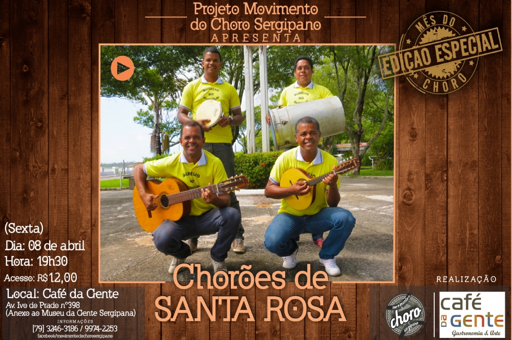 Os Chorões de Santa Rosa são a próxima atração da programação especial em homenagem ao mês do Choro. O evento acontece nesta sexta-feira, 8, a partir das 19h30, no Café da Gente, em anexo ao Museu da Gente Sergipana, localizado na avenida Ivo do Prado. Os ingressos custam R$ 12 e outras informações podem ser obtidas através do telefone (79) 3246 3186 ou 9974 2253.