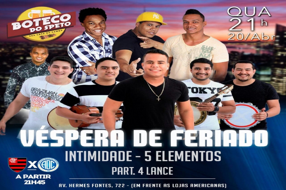 A banda Cinco Elementos promete agitar a véspera de feriado no Boteco do Speto. Nesta quarta-feira, 20, a partir das 22h, o grupo comandado por Saulinho Samba vai contagiar a galera com muito samba e alto astral.