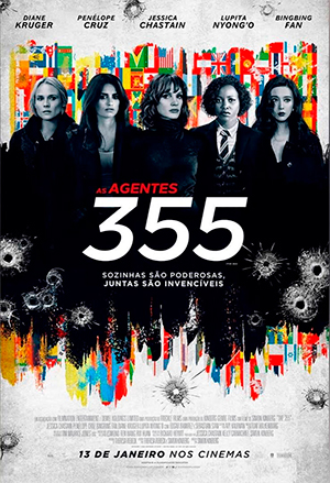 Quando uma arma ultrassecreta cai nas mãos de um grupo de mercenários que ameaçam o mundo, a agente da CIA Mace Brown (Jessica Chastain) terá que unir forças para uma missão letal com a agente alemã Marie (Diane Kruger); a ex-membro do MI6, especialista em computadores, Khadijah (Lupita Nyong’o); a psicóloga Graciela (Penélope Cruz), e com Lin Mi Sheng (Bingbing Fan), uma mulher misteriosa que está rastreando todos os seus movimentos. Cheio de adrenalina, ‘As Agentes 355′ apresenta inúmeras cenas de ação ao redor do mundo, dos cafés de Paris e mercados do Marrocos à riqueza e glamour de Xangai.