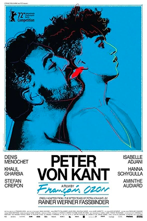 PETER VON KANT. Dir. François Ozon. Comédia, drama. 2022. 86 min. 16 anos. Peter von Kant é um diretor de cinema de sucesso e mora com seu assistente Karl, a quem gosta de maltratar e humilhar. Sidonie, uma grande atriz que foi sua musa por muitos anos, o apresenta a Amir, um belo e modesto jovem. Peter se apaixona por Amir e se oferece para dividir seu apartamento com ele e ajudá-lo a entrar na indústria cinematográfica. O plano funciona, mas assim que ganha fama, Amir termina com Peter, deixando-o sozinho para enfrentar seus demônios.