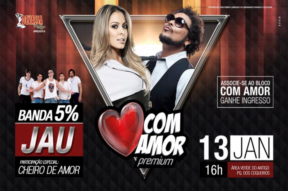 Milhares de sergipanos já esperam ansiosos pelo Pré-Caju, que esse ano acontecerá entre os dias 17 e 20 de janeiro. Para deixar os foliões em ponto de bala para a prévia carnavalesca, o Augustu’s produções promove no domingo (13), o Com Amor Premiun. A festa vai acontecer no antigo Hotel Parque dos Coqueiros, a partir das 16 horas, com a presença no palco do cantor Jau e da banda 5%. Mais não é só! A folia também contará com a participação especial de Alinne Rosa e toda trupe da banda Cheiro de Amor.