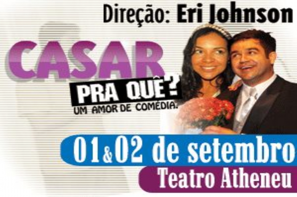 Com direção de Eri Johnson, a peça Casar pra quê? será apresentada no teatro Atheneu nos dias 1º e 2 de setembro, às 21h e 20h, respectivamente. O espetáculo, que já tem cinco anos em cartaz, conta com a participação dos atores Alessandro Anes e Michelle Martins