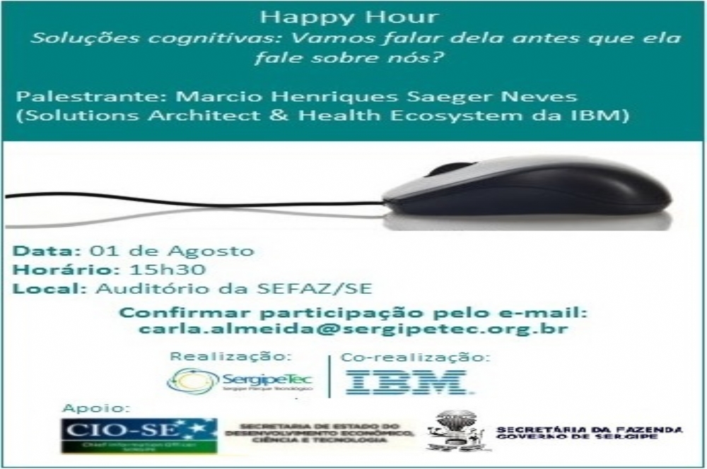 “Soluções cognitivas: vamos falar dela, antes que ela fale sobre nós?” é a temática do Happy Hour que acontece nesta terça-feira, dia 1º de agosto, com Marcio Saeger, Solutions Architect & Health Ecosystem, da IBM. Voltado para profissionais e empresários atuantes na área de Tecnologia da Informação e Comunicação (TIC), o treinamento é uma iniciativa do Sergipe Parque Tecnológico (SergipeTec) e da IBM, com o apoio do CIO-SE (Associação dos Gestores de Tecnologia da Informação do Estado de Sergipe), da Secretaria de Estado do Desenvolvimento Econômico, Ciência e Tecnologia (Sedetec) e Secretaria de Estado da Fazenda (Sefaz).