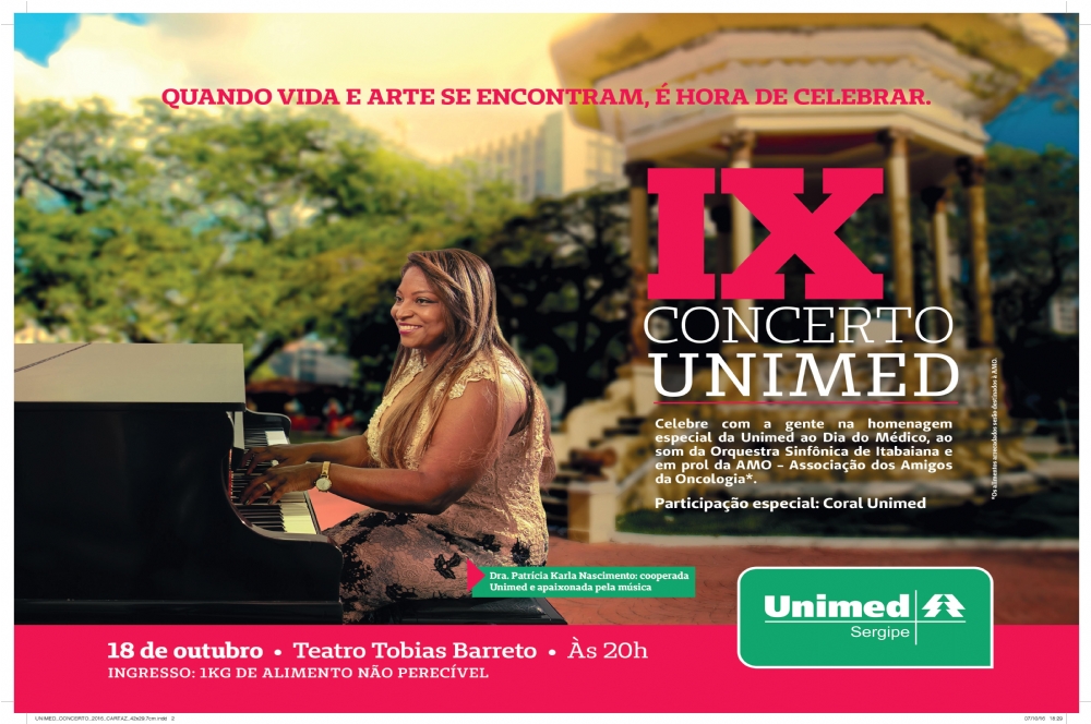 Quando vida e arte se encontram, é hora de celebrar. Esse é o mote que define a realização do IX Concerto Unimed, um evento que, pelo nono ano consecutivo, homenageia a classe médica sergipana através da boa-música em comemoração ao Dia do Médico. O Concerto, que já entrou para o calendário cultural do Estado, é uma iniciativa da Unimed Sergipe que une a valorização do trabalho médico, a promoção da cultura e a solidariedade em um espetáculo de rara beleza.