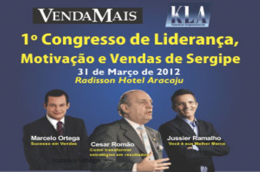 No próximo dia 31 de março, acontecerá em Aracaju o 1º Congresso de Liderança, Motivação e Vendas de Sergipe. O evento irá reunir grandes conferencistas, como Marcelo Ortega, que já falou para mais de 180 mil pessoas em países como Espanha, Paraguai e Argentina, César Romão, motivador das tropas de paz da Organização das Nações Unidas (ONU) e autor do livro 'A Semente de Deus' e Jussier Ramalho, que já proferiu palestras a empresas e universidades narrando sua trajetória de sucesso.