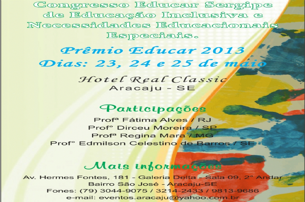 Com a finalidade de congregar os educadores e gestores educacionais acerca de uma reflexão bem como, oportunizar a atualização no que tange os desafios da educação contemporânea, o Congresso Educar Sergipe de Educação Inclusiva e Necessidades Educacionais Especiais, traz como tema “Ressignificando o Papel do Educador no Ambiente Inclusivo”, destinado a educadores, gestores educacionais, psicólogos, psicopedagogos, estudantes e profissionais de áreas afins. O Congresso é promovido pela Associação Brasileira de Educadores e será realizado nos dias 23, 24, 25 de maio de 2013 no Hótel Real Classic na Orla de Atalaia.
