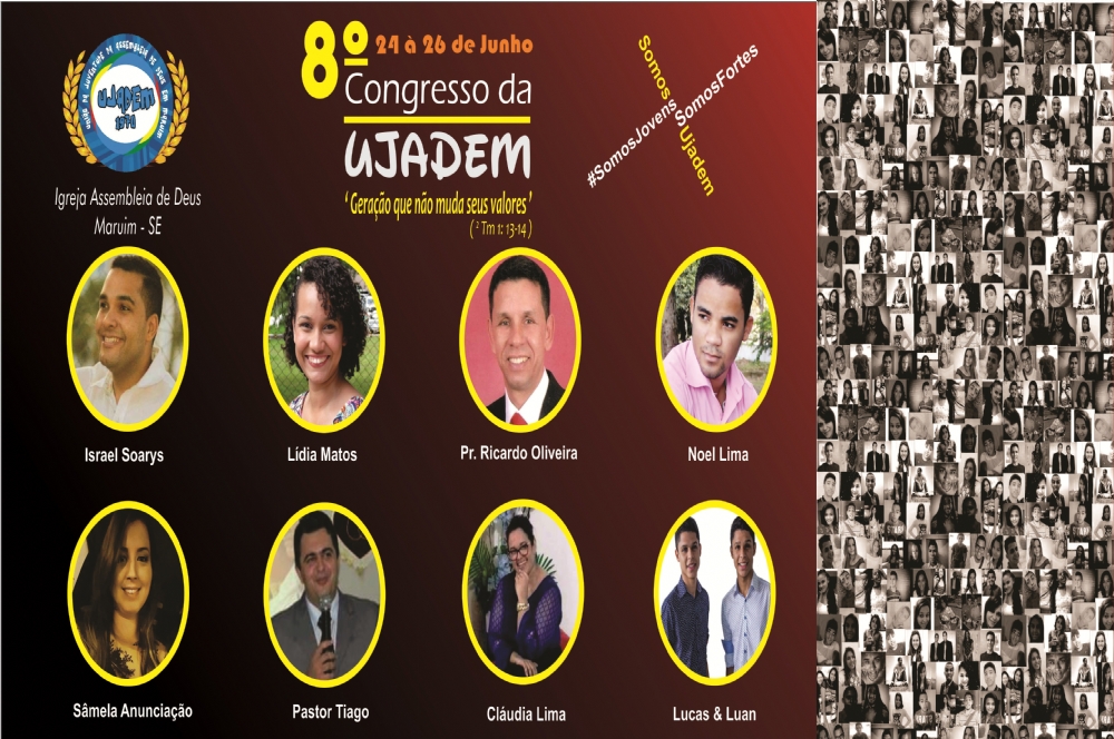 Nos dias 24, 25 e 26 de junho, acontecerá o 8° congresso da UJADEM (União da Juventude da Assembleia de Deus em Maruim) com o tema "Geração que não muda seus valores "(2 Tm. 1:13,14).