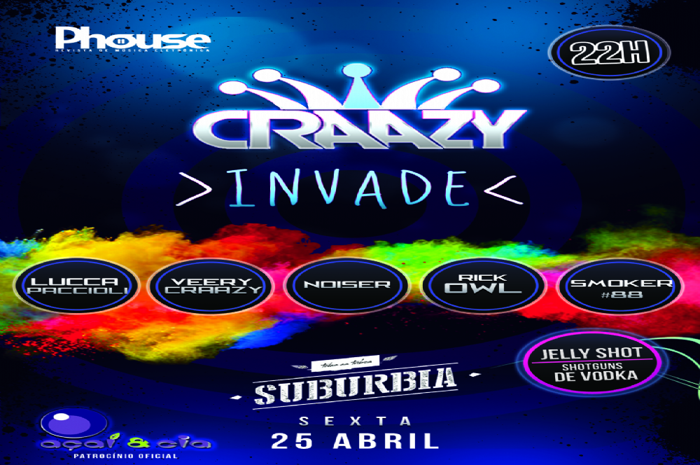 Aracaju recebe mais um evento da e-music, Craazy Invade que promete continuar o sucesso das cinco edições anteriores. O festival tem como objetivo trazer temas diferenciados e inovadores e agradar o maior número de pessoas. A festa acontece sexta-feira, 25, no Suburbia, a partir das 22h e no comando das pick ups os DJs Veery Craazy, Lucca Paccioli, Noiser, Rick Owl, Smoker#88, além das apresentações dos violinistas Rafael Gonçalves e Micaeli Bispo. A noite ainda conta com a performance de Ana Thais Santiago. Os ingressos estão sendo vendidos nas lojas Pipeline (shopping Riomar) e Litoral 655 (shopping Jardins). Mais informações através do telefone (79) 8828-9361