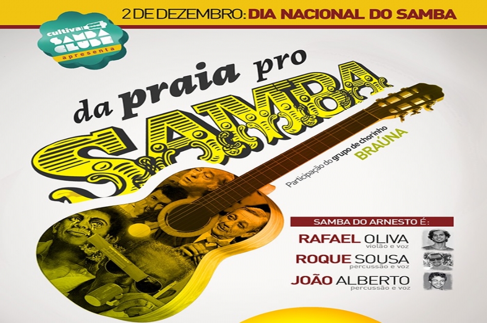 E pra balançar o esqueleto o grupo "Samba do Arnesto" formado por Rafael Oliva na voz e violão, Roque Sousa na percussão e voz e João Alberto na percussão e voz, vai fazer todo mundo sambar com os grandes clássicos do samba. Lembrando que o Cultiva Samba Clube é a tarde.