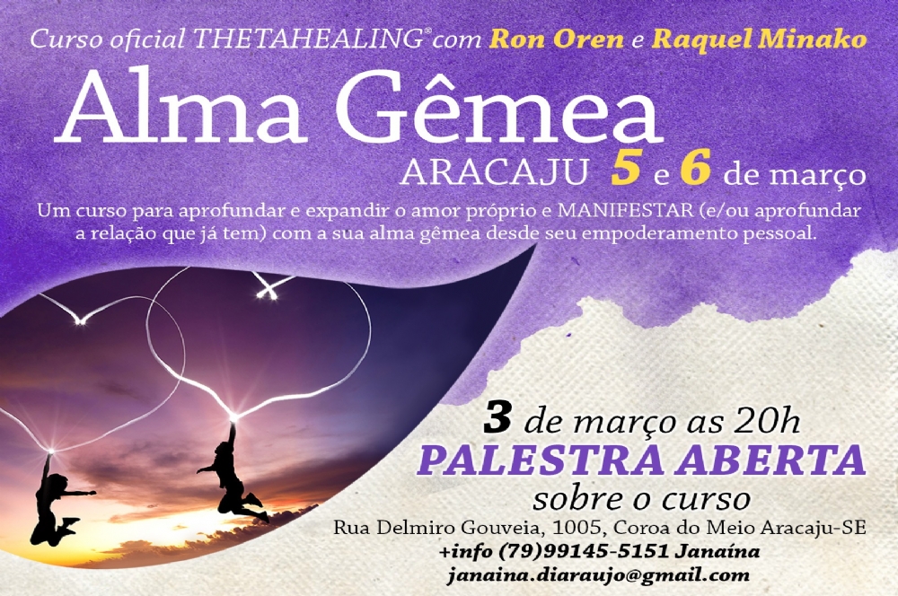 O curso Alma Gêmea ajuda você a atrair o(a) companheiro(a) mais adequado(a) para a sua vida e/ou trazer mais claridade e vida para a relação que você já tem com a sua alma gêmea. O evento conta com os instrutores de Thetahealing Ron Oren e Raquel Minako.