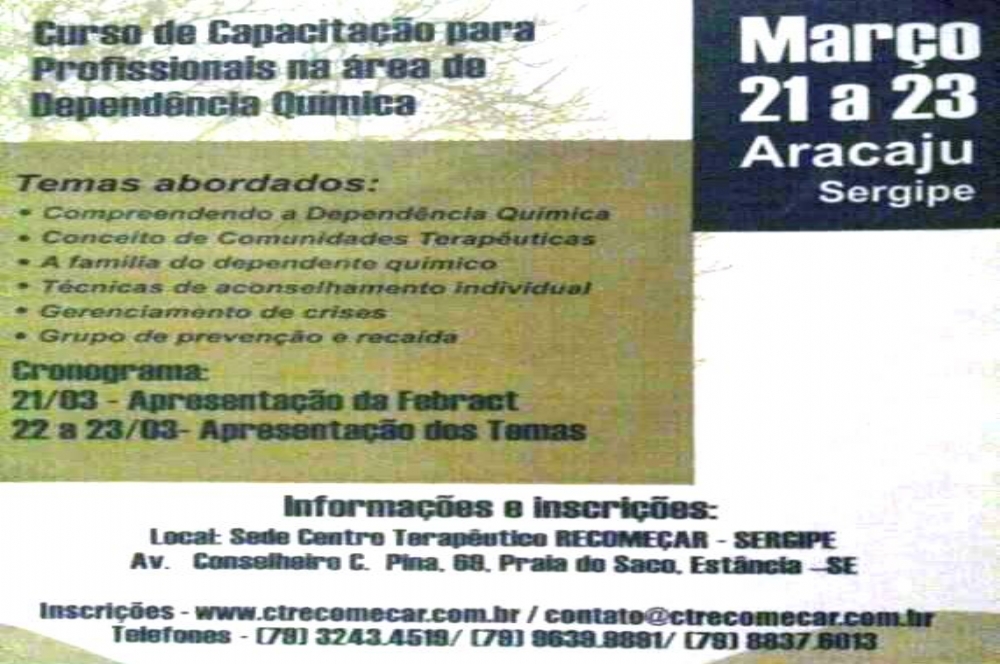 A capacitação será realizada nos dias 21, 22 e 23 de março, no auditório do Hospital São Lucas, em Aracaju, bairro São José. As aulas serão ministradas por profissionais da Federação Brasileira De Comunidades Terapêuticas (Febract- Campinas), instituição que há mais de 30 anos é referência nos país em tratamento e capacitação de profissionais.
