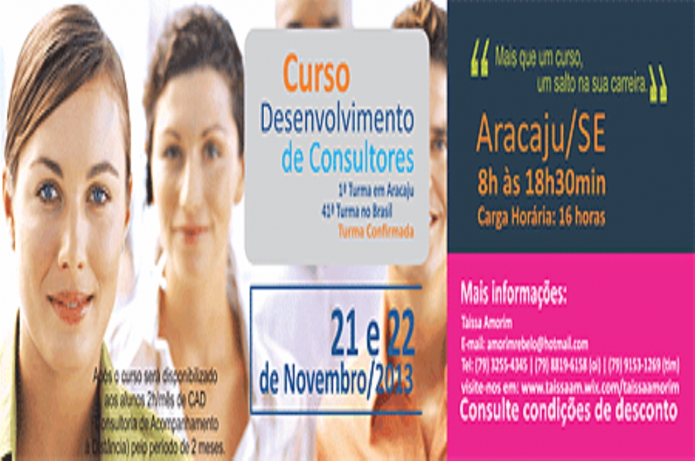 Taissa Amorim Consultora em Gestão de Pessoas traz a Aracaju o renomado Consultor, Coach e Conferencista Prof. Luiz Affonso Romano, do RJ, para ministrar o Curso de Desenvolvimento de Consultores em Aracaju nos dias 21 e 22 de Novembro do ano. Participe da promoção do Portal Infonet e concorra a cortesia.