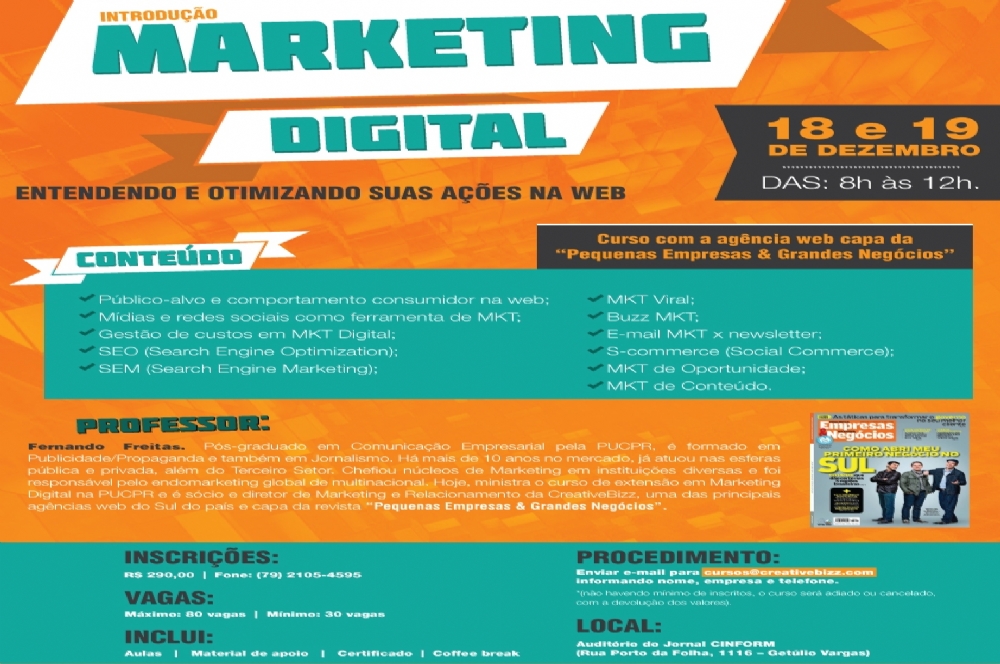 O curso acontece nos dias 18 e 19 de dezembro, das 8h às 12h, no auditório do jornal CINFORM (Rua Porto da Folha, 1116 – Getúlio Vargas). As inscrições podem ser feitas através do telefone (79) 2105-4595 ou pelo e-mail cursos@creativebizz.com. O investimento é de R$ 290, já contemplando aulas, material de apoio, certificado e coffee break em ambos os dias. Vale a pena participar! Mas corra, porque as vagas são limitadas.
