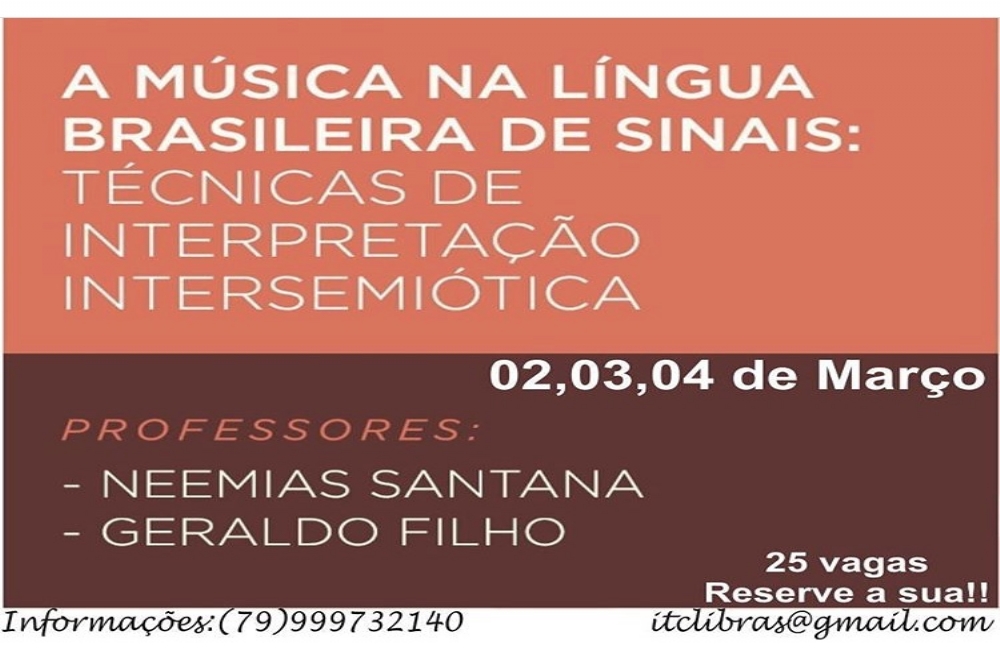 O professor da Universidade de Brasília (UnB) e intérprete/ tradutor de Libras, Neemias Santana, estará em Aracaju, nos dias 2, 3 e 4 de março, ministrando o curso “A Música na Língua Brasileira de Sinais: técnicas de interpretação intersemiótica”.