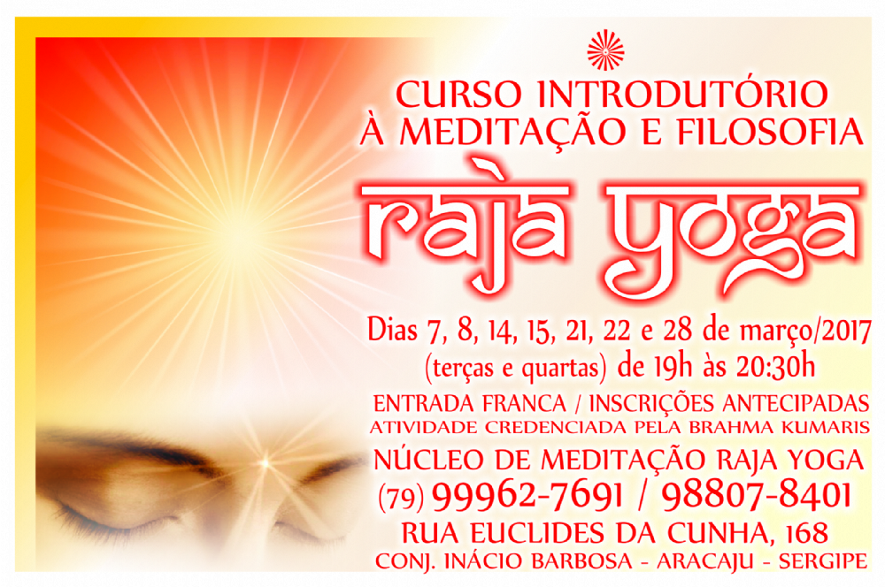 O Ponto de Serviço da Brahma Kumaris promove o curso de meditação Raja Yoga entre os dias 7 e 28 de março de 2017. O curso acontecerá nos dias de terça e quarta, das 19h às 20h30, no Núcleo de Meditação Raja Yoga, que fica na Rua Euclides da Cunha, n° 168, conjunto Inácio Barbosa. A entrada é franca e as inscrições precisam ser feitas antecipadamente pelos telefones (79) 99962 7691 e 98807 9401.