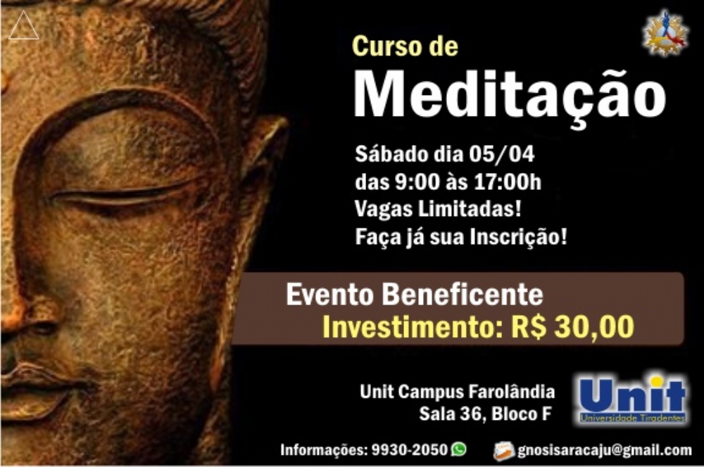 O Curso de Meditação acontece no sábado, 5, das 9h às 17h, Campus Unit Farolândia, Bloco F, sala 36. As vagas são limitada e as inscrições custam R$ 30. Informações através do telefone (79) 9930 2050. O evento é beneficente.
