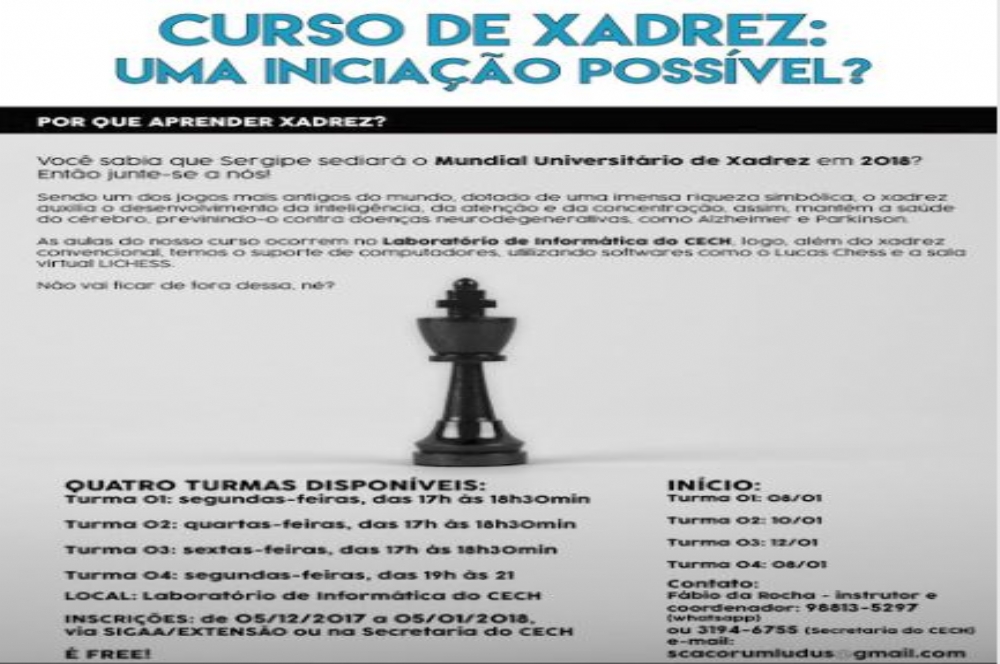 O curso de iniciação ao xadrez em laboratório de informática com uso de programas e internet e xadrez convencional acontece entre os dias 8 de janeiro e 12 de março.