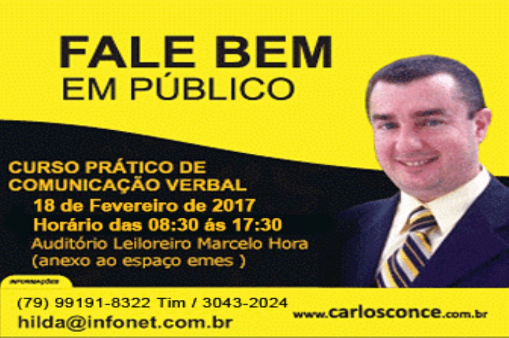 "Você tem medo de falar em público? Quer aprender técnicas para fazer uma apresentação de sucesso? Faça como governadores, magistrados, líderes empresariais e profissionais liberais de todo Brasil. Participe do curso 'Como falar bem em reuniões e apresentações' com o Professor Carlos Conce, mestre em Comunicação pela Universidade Federal do Rio de Janeiro.