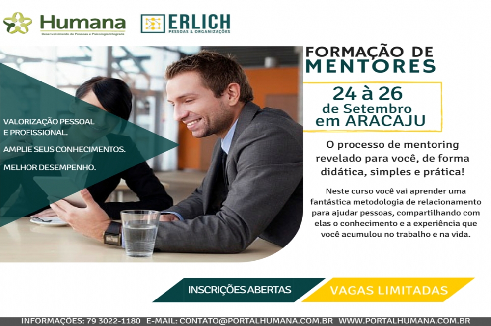 A Humana Desenvolvimento de Pessoas trará pela primeira vez em Aracaju a Formação em Mentoring nos dia 24,25 e 26 de Setembro. Mentoring (ou mentoria) é um recurso utilizado para desenvolver pessoas e fazê-las alcançar metas, seja no campo profissional seja na vida em geral. É um processo colaborativo em que um indivíduo que possui determinado conhecimento e experiência (mentor) utiliza essa bagagem para promover o crescimento de outra pessoa (mentorado).