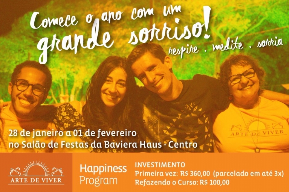 Será realizado no período de 28 de janeiro a 1º de de fevereiro no Salão de Festas da Baviera Haus [rua Arauá], o curso Happiness Program – Respiração e relaxamento.