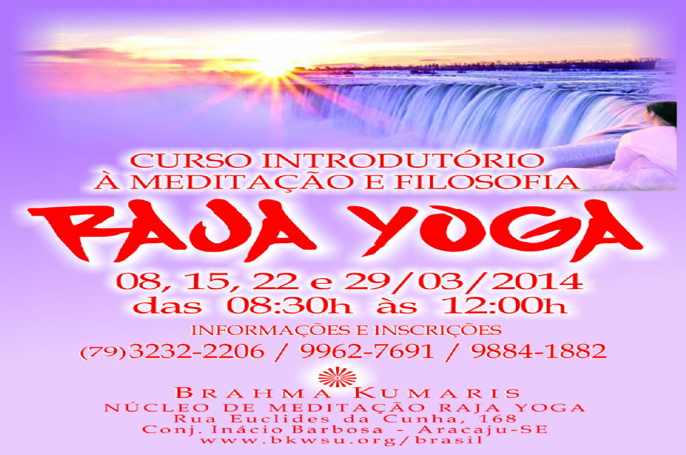 O Ponto de Serviço da Brahma Kumaris promove o curso de meditação Raja Yoga nos dias 8, 15, 22 e 29 de março (sábados). O curso acontecerá sempre aos sábados, no Núcleo de Meditação Raja Yoga, na Rua Euclides da Cunha, n° 168 no conjunto Inácio Barbosa. A entrada é franca e as inscrições precisam ser feitas antecipadamente pelos telefones 3232 2206 / 9962 7691 / 9884 1882.