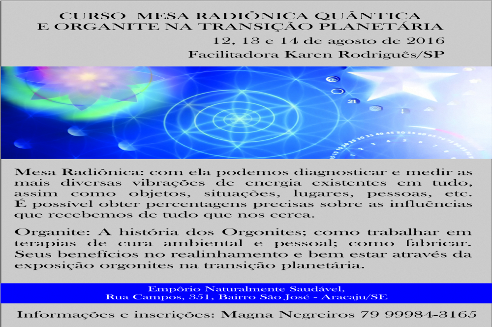 Nos dias 12, 13 e 14 de agosto, o Empório Naturalmente Saudável Receberá O Curso Mesa Radiônica e Organite na Transição Planetária. O curso será ministrado Karen Rodrigues/SP.
