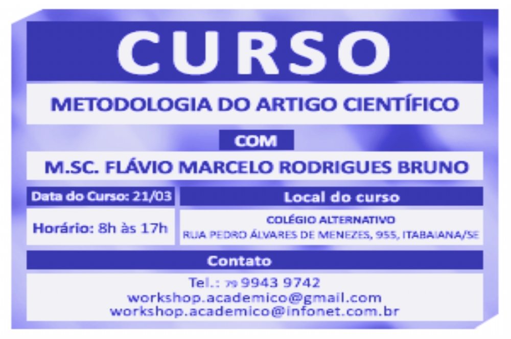 O curso será realizado no dia 21 de março, das 8h às 17h, no Colégio Alternativo em Itabaiana/SE, visando preparar iniciantes na pesquisa científica. Serão abordados aspectos metodológicos e dicas para a construção de um artigo científico. O curso será ministrado pelo professor Flávio Marcelo Rodrigues Bruno. Informações através do telefone (79) 9943 9742. Participe da promoção do Portal Infonet e concorra a ingresso.