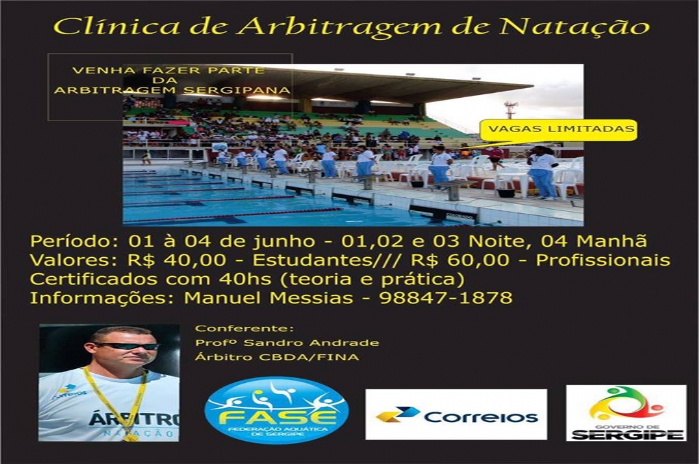 A Federação Aquática de Sergipe (FASE) estará realizando entre os dias 1 e 4 de junho o curso de capacitação para novos árbitros de natação. A inscrição é aberta para qualquer pessoa acima dos 16 anos, valendo-se em termos de taxa: estudantes pagam um valor de R$ 40; não estudantes R$ 60. No final do curso, os participantes recebem um certificado de 40 horas e passam a integrar a lista de árbitros da Federação. Para realizar inscrições e outras informações, entrar em contato com Manuel Messias, através do número (79) 98847-1878.