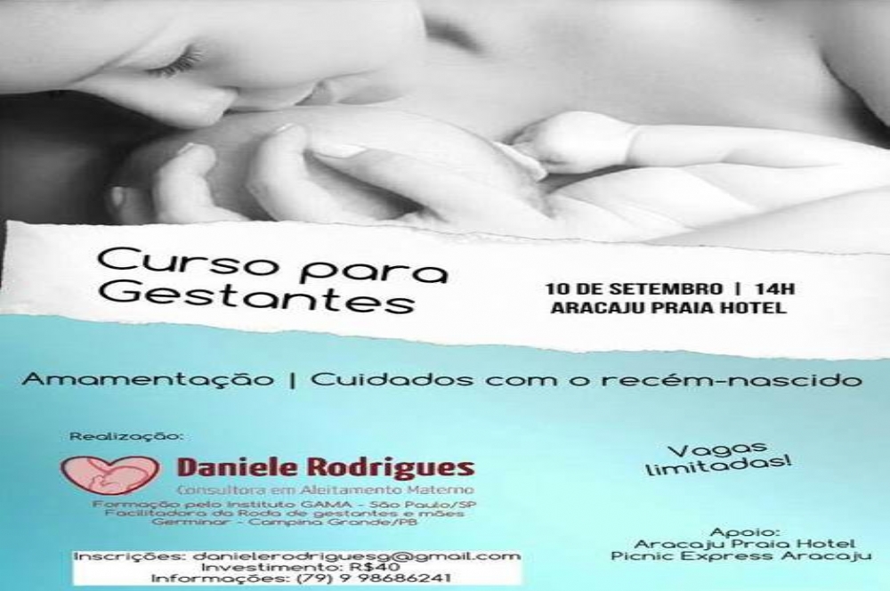 No dia 10 de setembro, será realizado o Curso para gestantes, com a consultora em aleitamento materno Daniele Rodrigues. O foco será a amamentação e os primeiros cuidados com o recém-nascido, especialmente técnicas que facilitem o aleitamento materno e a rotina da família nas primeiras semanas. O curso ocorre no às 14 horas, no Aracaju Praia Hotel.