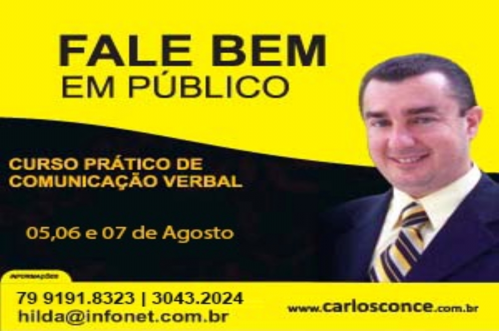 Você tem medo de falar em público? Quer aprender técnicas para fazer uma apresentação de sucesso? Faça como governadores, magistrados, líderes empresariais e profissionais liberais de todo Brasil. Participe do curso “Falar bem” com o Professor Carlos Conce, mestre em Comunicação pela Universidade Federal do Rio de Janeiro. O curso acontece acontece em Aracaju nos dias 5, 6 e 7 de agosto, no auditório Marcelo Hora, anexo ao Espaço Emes. Participe da promoção do Portal Infonet e concorra a ingresso.