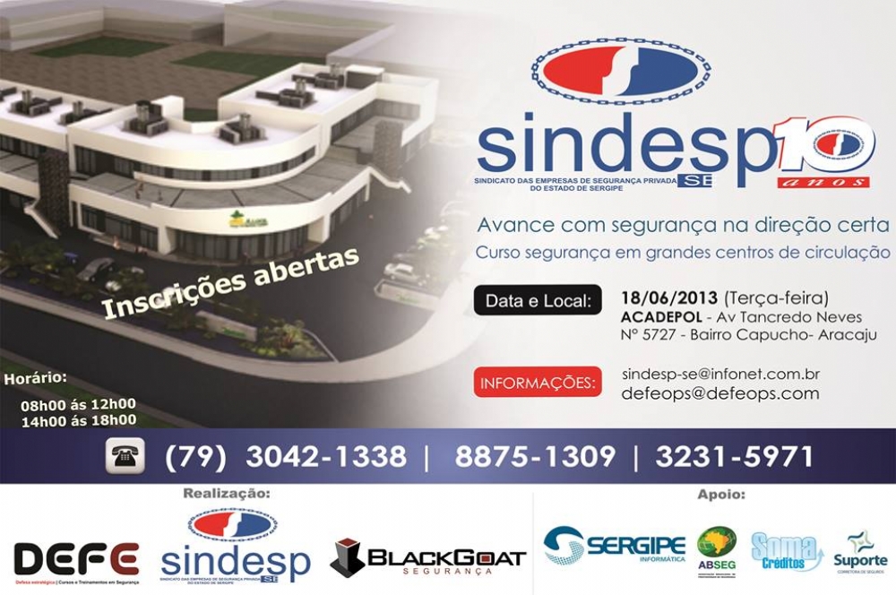 Na próxima terça-feira, 18, o SINDESP (sindicato das empresas de segurança privada do estado de Sergipe), realizará o curso “Segurança em grandes centros de circulação”. O evento terá como ministrante do curso o diretor executivo da empresa Defesa Estratégica, Cristiano Damásio.
