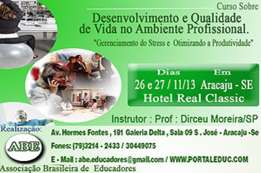 Curso sobre Desenvolvimento e Qualidade de Vida no Ambiente Profissional – gerenciamento do stress e otimizando a produtividade. O curso acontece nos dias 26 e 27 de novembro, no Hotel Real Classic. O instrutor será o professor Dirceu Moreira/SP.
