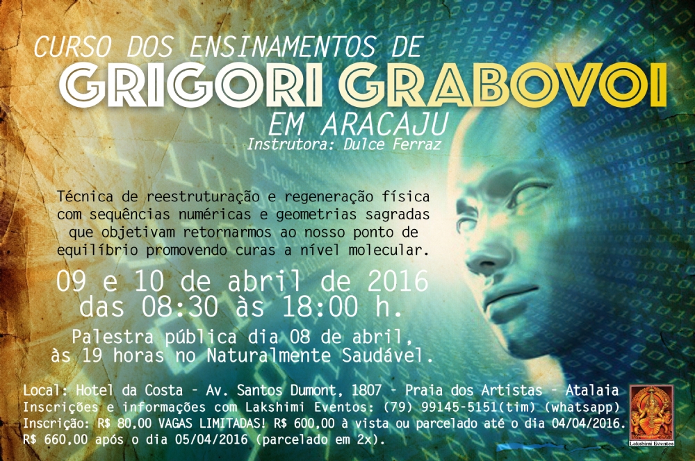 A Terapia Quântica da Consciência é curso de cura através dos números que é baseado nos ensinamentos de Grigori Brabovoi. Dulce Ferraz será a instrutora do evento que acontece nos dias 9 e 10 de abril, das 8h30 às 18h, no Hotel da Costa, localizado na Avenida Santos Dumont, Atalaia.