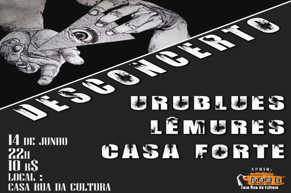 A Casa Rua da Cultura recebe no dia 14 de junho, o show “Desconcerto. A partir das 21h, Urublues, Lêmures e Casa Forte garantem a animzação da galera. Ingressos serão vendidos por R$ 10 na portaria do evento.