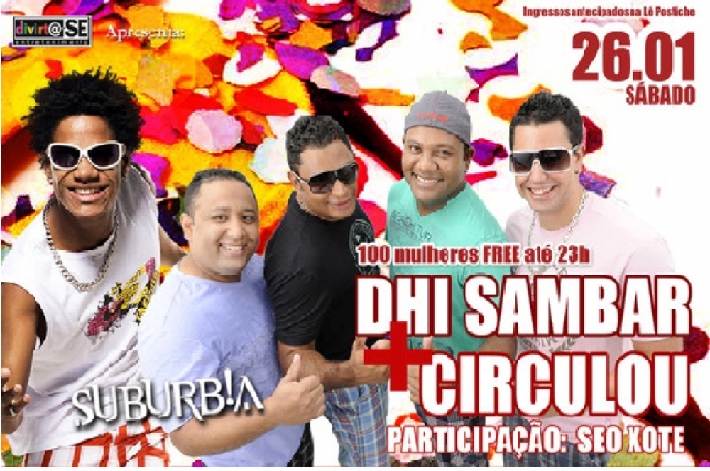 Neste sábado, 26, a partir das 22h, as bandas Dhi Sambar e Circulou estarão juntas pela primeira vez na casa de show Subúrbia (Coroa do Meio). Muita gente bonita, azaração e já entrando no clima do Carnaval. E ainda participação de Seo Xote e as primeiras 100 gatinhas serão Free até as 23h! Não fique de fora e venha curtir com a gente até o amanhecer!