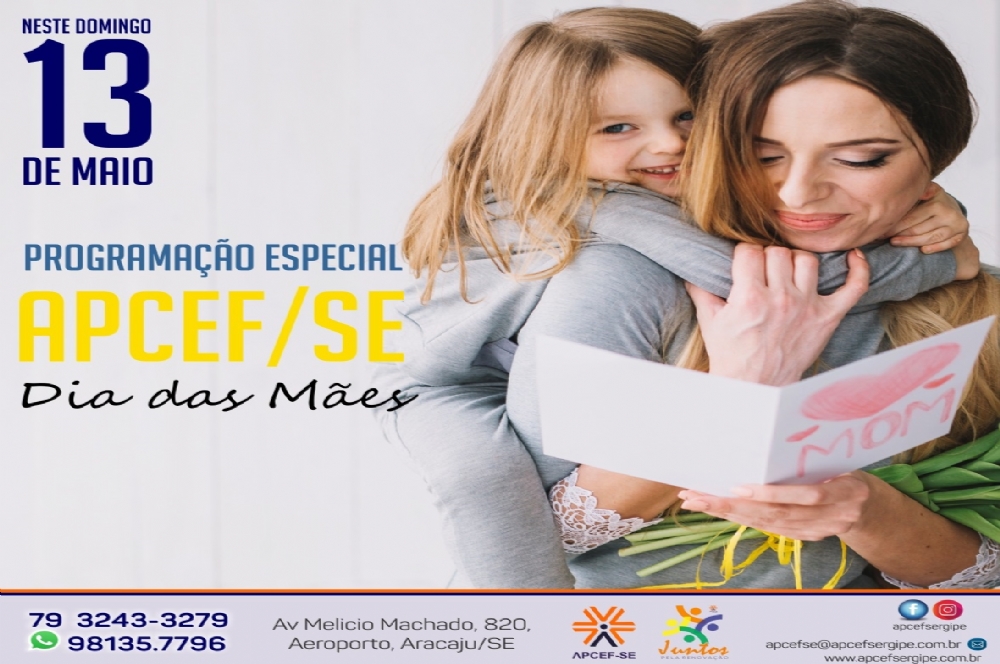 A Associação do Pessoal da Caixa (Apcef/Se) preparou uma programação especial em homenagem às mães, associadas e convidadas, que vierem ao Clube neste DOMINGO, dia 13 de maio.