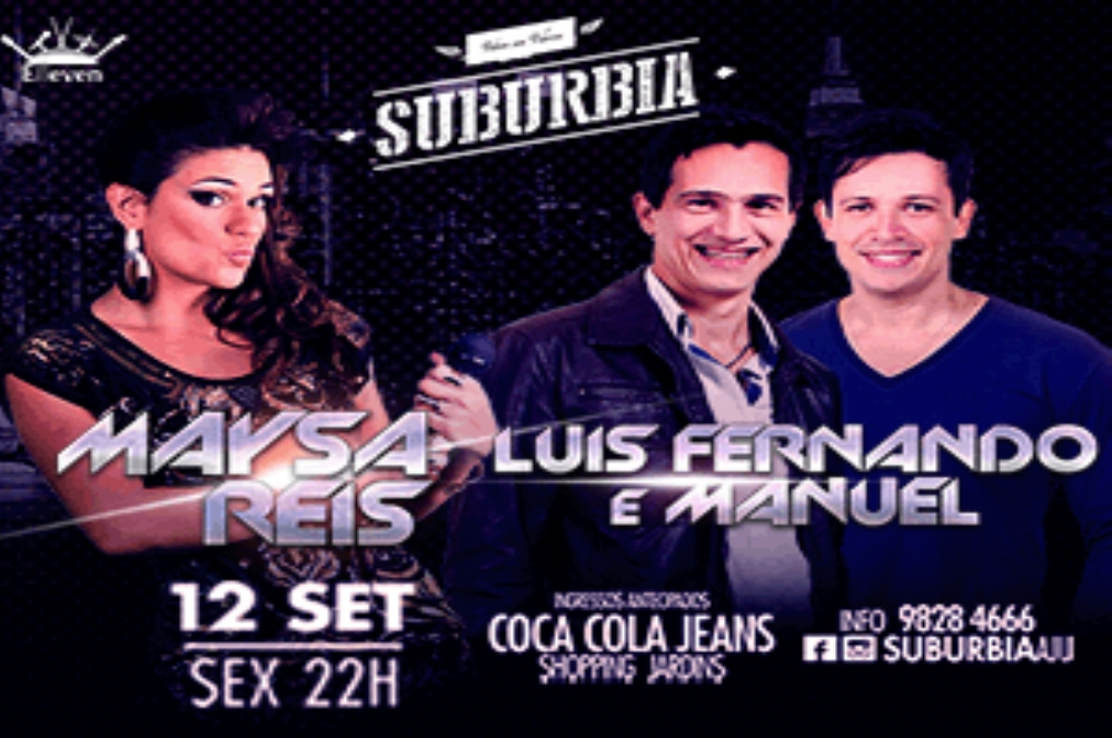 Nessa sexta, 12, tem dobradinha na casa de todas as tribos. Depois do sucesso dos shows do Bonde do Stronda e U2Cover de São Paulo nas últimas semanas, o Subúrbia aposta agora no sertanejo dançante de Luis Fernando e Manoel, com a princesa do axé sergipano, Maysa Reis e seu novo axé. Os shows prometem fazer o clima ficar quente! Os ingressos já estão a venda na Coca Cola Jeans (Shopping Jardins). Participe da promoção do Portal Infonet e concorra a ingresso.