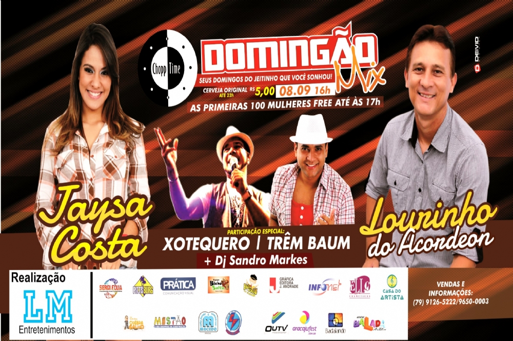 Lourinho do Acordeon e Jaysa Costa comandam o Domingão Mix do Chopp Time no dia 8 de setembro. O DJ Sandro Markes também participa da festa junto às bandas Trêm Baum e Xotequero.