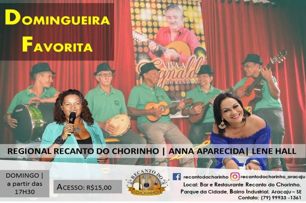 O Bar e Restaurante Recanto do Chorinho, fundado a mais de 28 anos conhecido com um dos pontos mais tradicionais do Choro em Sergipe, receberá mais uma edição da Domingueira Favorita, no dia 18 de setembro. O evento está programando para começar ás 17h30. O estabelecimento é localizado no Parque da Cidade, no Bairro Industrial. O ingresso custa R$ 15 e está a venda no local do evento.
