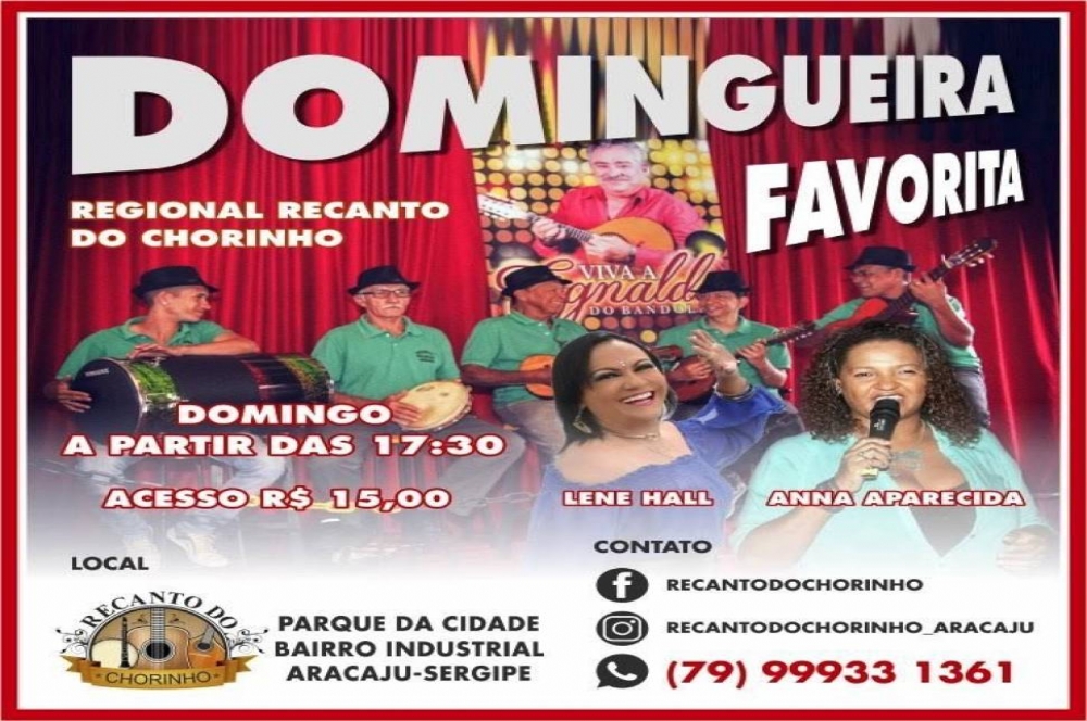 O Bar e Restaurante Recanto do Chorinho convida a todos para mais uma edição da Domingueira Favorita (25/09), embalada de muita música e caipirinha dobrada. No palco, o Grupo Musical Regional Recanto do Chorinho inicia a festa ao som de samba canção na voz a cantora Anna Aparecida, em seguida Lene Hall agita a galera, ao som da boa e tradicional música popular brasileira.