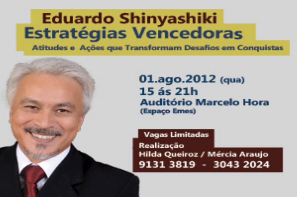 Com o objetivo de proporcionar condições objetivas para que o participante expanda a postura de criador de contextos, elevando a autoconfiança e fortalecendo a motivação e o compromisso com a excelência, será realizado o seminário ‘Estratégias Vencedoras’. O curso, que será promovido no dia 1º de agosto, das 15h às 21h, no auditório Marcelo Hora do Espaço Emes, será ministrado pelo palestrante e consultor organizacional, Eduardo Shinyashiki.