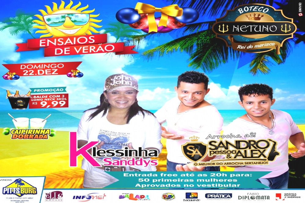 O ensaio de verão do Boteco do Netuno do próximo domingo, 22, terá Kessinha Sanddys e a dupla Sandro Pessoa e Alex. Para agitar ainda mais, a festa terá Caipirinha dobrada e promoção de balde com três long necks skol por apenas R$ 9,99.