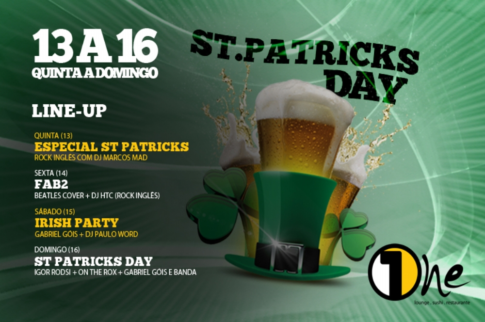O ONE entra em clima irlandês para comemorar o Saint Patrick`s Day. Trata-se de uma tradição anual que celebra o domínio da chegada de São Patrício, um dos padroeiros da Irlanda. Na sexta-feira, 14, FAB2 (Beatles Cover) e DJ HTC (rock inglês) são as atrações.