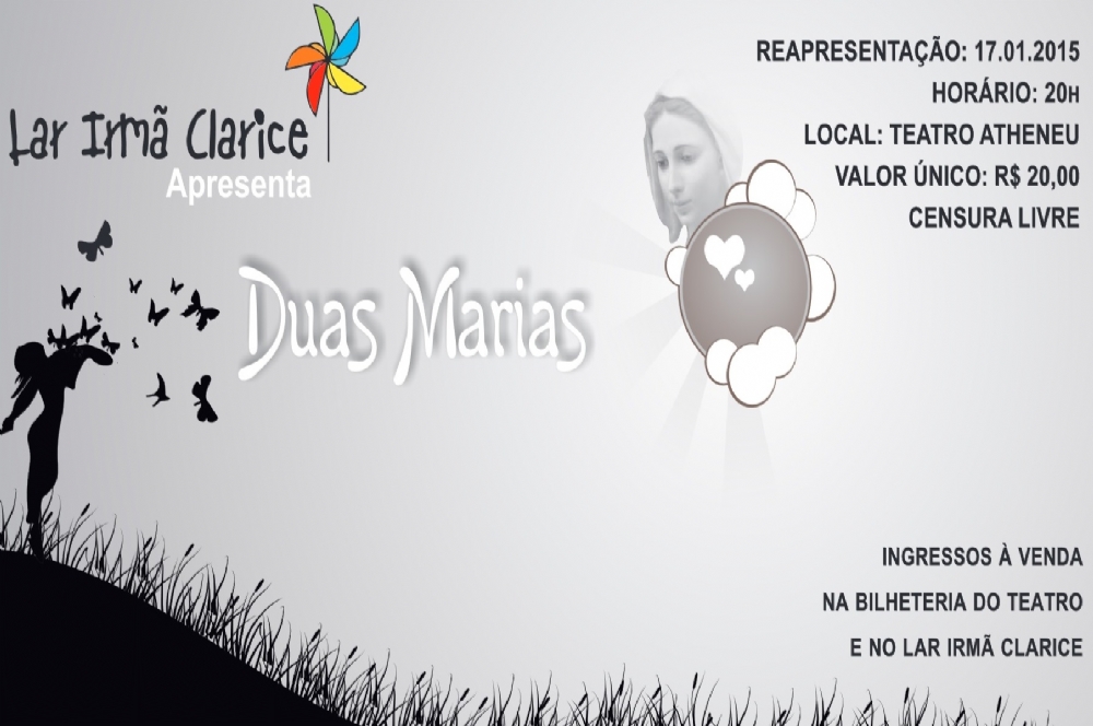 A peça “Duas Marias” estará em cartaz no dia 17 de Janeiro, às 20h, no Teatro Atheneu. Essa é a quarta vez que a peça entra em cartaz. A peça é baseada na personagem Maria de Magdala – do livro Maria de Magdala – a pecadora vestida de luz -, da médium Shyrlene Soares Campos. A peça busca retratar a sua significância e corajosa contribuição para a humanidade, no exemplo de força, decisão e atitude, comprovada nesta experiência, como espírito reencarnado com o objetivo de ensinar a todos nós a capacidade de vencer grandes desafios, neste significativo percurso disponível pelo Pai, almejando o aprendizado. Ingressos à venda na bilheteria do Teatro Atheneu ao preço de R$ 20. Informações através do telefone (79) 3213 7468. Participe da promoção do Portal Infonet e concorra a ingresso.