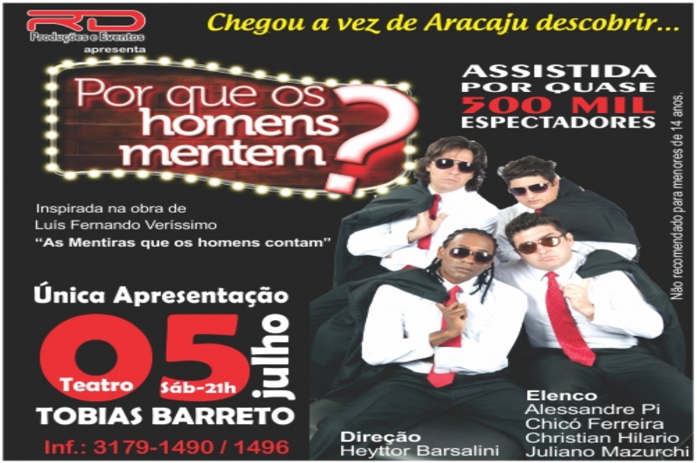 A hilariante comédia de humor inteligente “Por que os homens mentem?”chega a Aracaju no Teatro Tobias Barreto em única apresentação no dia 05 de Julho às 21h. A comédia é uma adaptação do livro “As mentiras que os homens contam”, do renomado autorLuís Fernando Veríssimo e agrada por proporcionar identificação imediata com o público. A apresentação é dividida em esquetes onde os atores se revezam nos papéis de esposa e marido e retratam cenas do cotidiano de amigos e casais. “Todo mundo já deve ter vivido pelo menos alguma das cenas que apresentamos”. No elenco estão os atores Alessandre Pi, Chicó Ferreira, Christian Hilarioe Juliano Mazurchi.