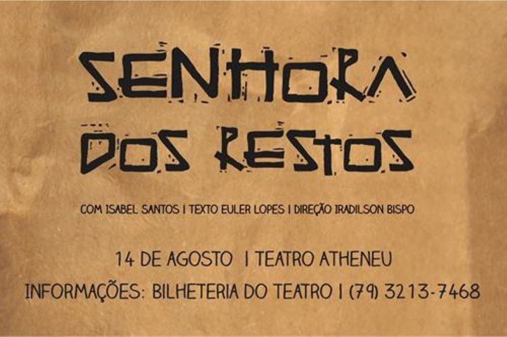 O espetáculo “Senhora dos Restos” será realizado no dia 14 de agosto, no Teatro Atheneu. Sob direção de Iradilson Bispo, Isabel Santos dá vida ao texto de Euler Lopes, que retrata a história de uma mulher idosa, moradora do Mercado Municipal de Aracaju. Informações sobre o espetáculo estão disponíveis através do telefone (79) 3213 7468. Participe da promoção do Portal Infonet e concorra a ingresso.