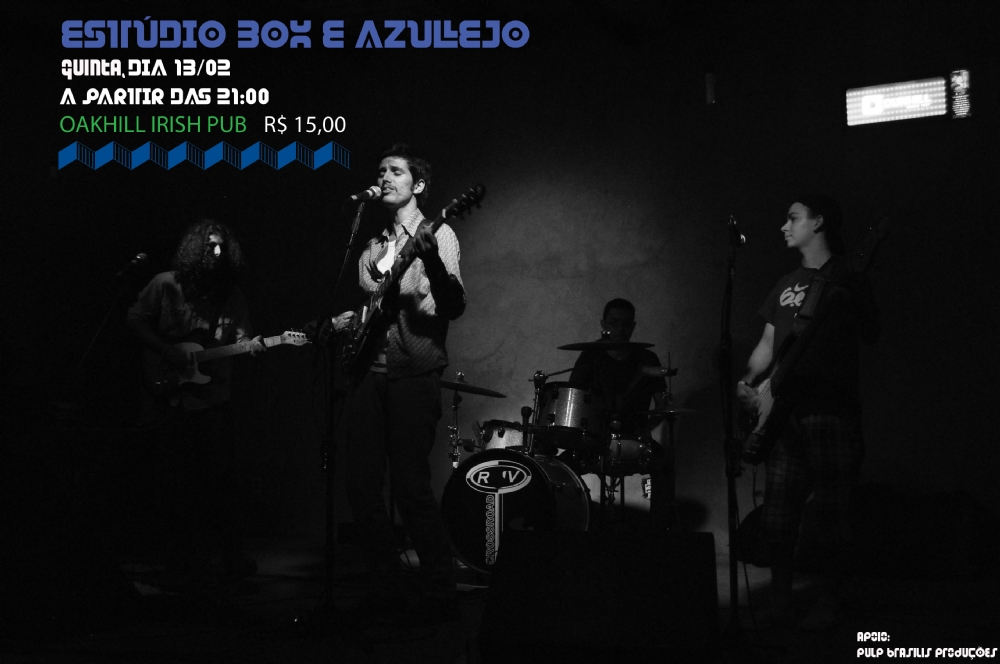 A banda Box e Azulejo apresenta seu rock n' roll brazuca no Oakhill Irish Pub, dia 13/02 (quinta-feira) a partir das 21h. A entrada custará R$ 15. Reservas através dos telefones 9102 3366 ou 3023 2417. A Oakhill Irish Pub está localizada na Avenida Gonçalo Prado Rollemberg, 459.