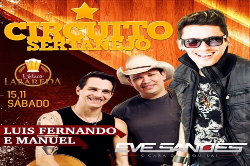O cantor Eve Sandes comanda mais uma edição do Circuito Sertanejo do Boteco Labareda. A festa acontece neste sábado, 15, a partir das 22h. A dupla Luís Fernando & Manuel também agita o evento.
