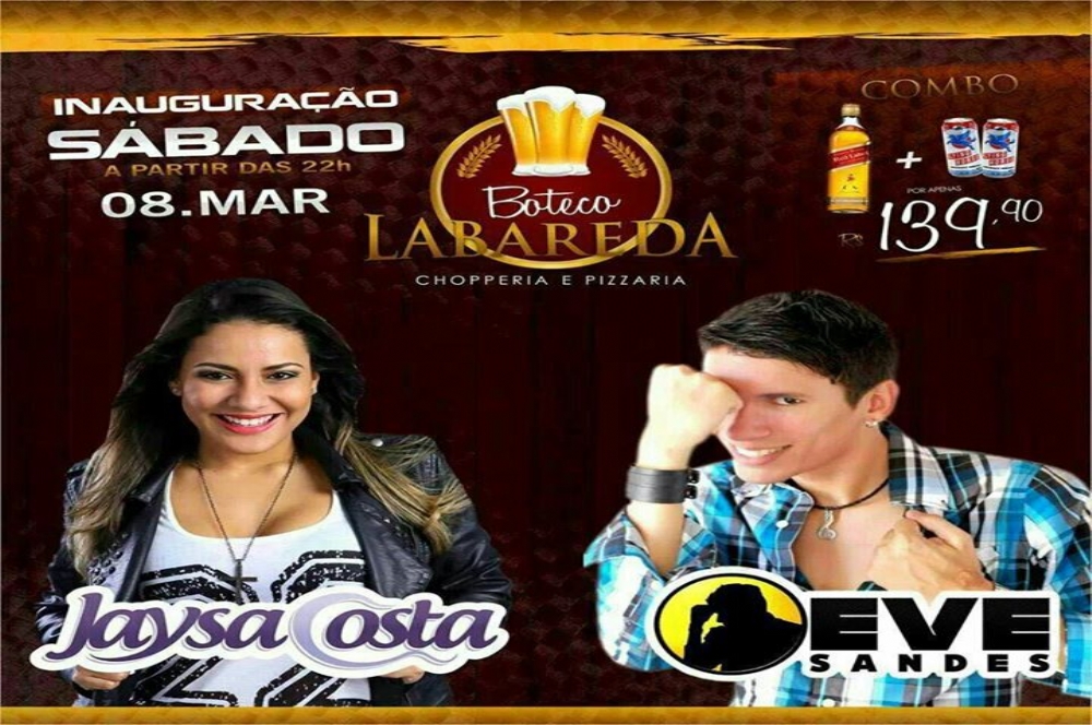 A inauguração da Choperia e Pizzaria Boteco do Labareda acontece neste sábado, 8, a partir das 22h. Com muita irreverência e alto astral, o cantor Eve Sandes promete mais um show pra lá de animado. Jaysa Costa também participa da festa.